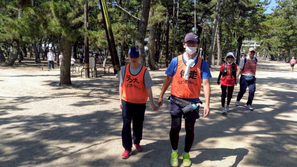 過去最高気温が近づく中、津田の松原の木陰の中を、適度に休憩をとりながら、歩いたり、走ったりしました。